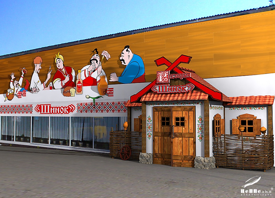и эскиз оформления фасада для ресторана "Шинок"